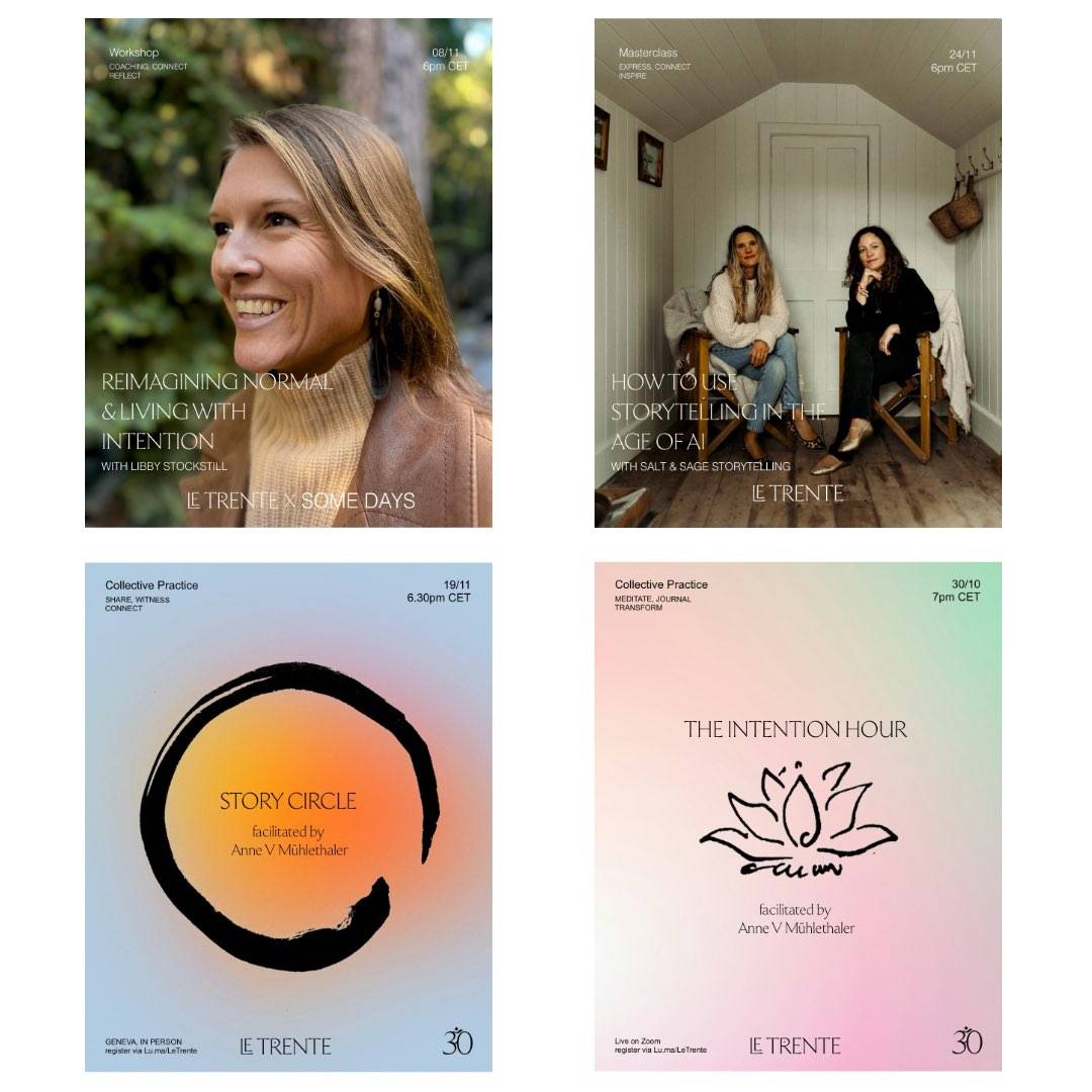 Also, a quick note on pricing. At Le Trente, we believe in making transformative learning and reflective gatherings accessible to all. For the masterclasses, we're suggesting a contribution of 35 CHF, but we operate on a pay-what-you-can basis. Whether you can contribute 35 CHF or 1 EUR, what matters most is your commitment to showing up and engaging with this unique content. Why do we ask for payment? We've learned that when we invest (even a small amount) we're more likely to prioritise and attend. (Translation: when I sign up for free events, I rarely show up. I assume it's true for you too!)