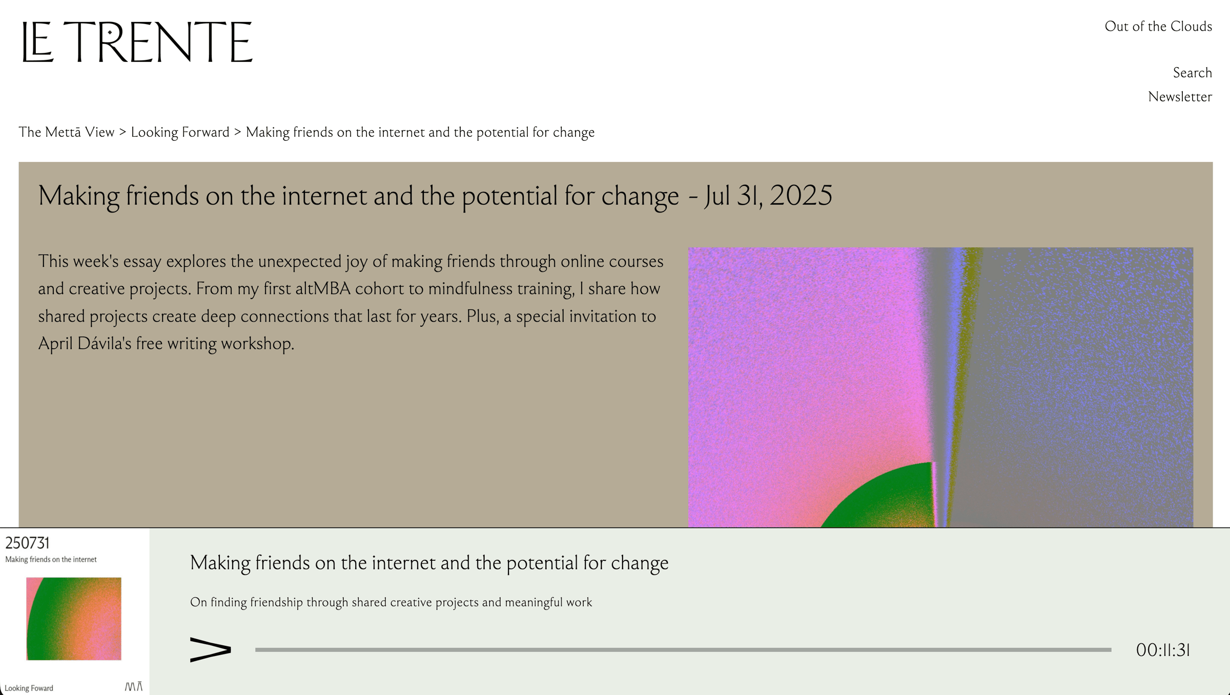 ListenNEW THIS WEEK: The Mettā Interview — Giulia Galli, parental coach and author of When a Parent Is Born, explores her question: "What is my intention?" A conversation about stepping off autopilot, the power of words, and the quiet revolution of raising children who can think for themselves. Subscribe via Apple Podcasts | Spotify or listen here From the archivesOut of the Clouds — Yancey Strickler on Bento and post-individualism. Kickstarter co-founder unveiling a radical economic model for how artists can pool resources, share profits and own their work—imagine if the next Disney was an artist-owned collective, not a corporate giant. → Listen here The Mettā View: Making friends on the internet — A recent conversation with friends highlighted the general misunderstanding around a business model based on live interactions, instead of selling pre-recorded courses. → Read or listen here |